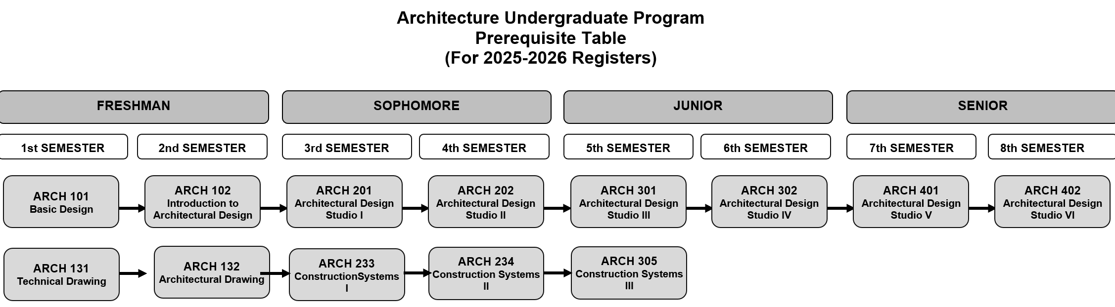 | ARCH 102 | Introduction to Architectural Design | Must | 4 – 4 | 6 | 8,00 | ||||